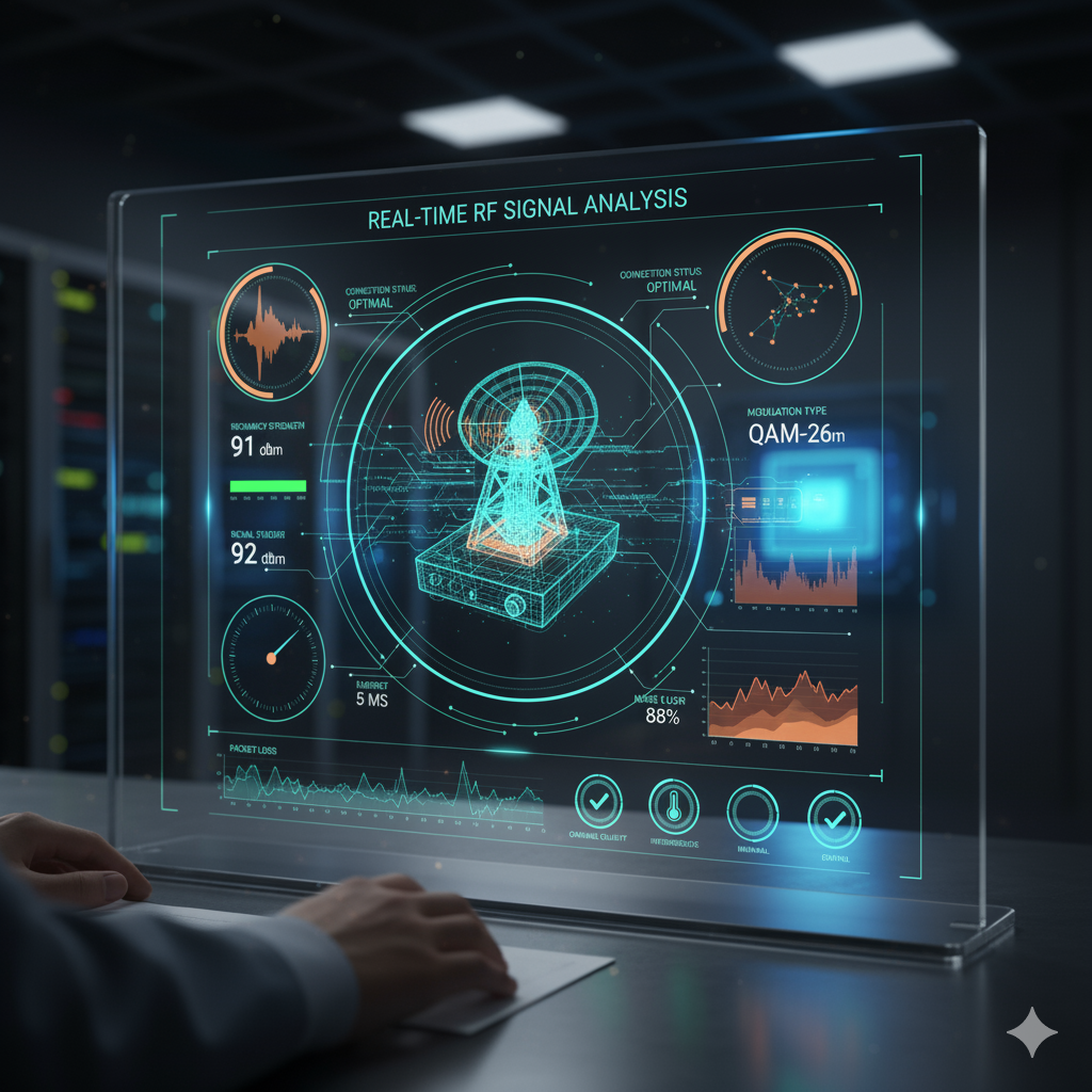 Real-time network metrics including RF signal, throughput, and connectivity quality.